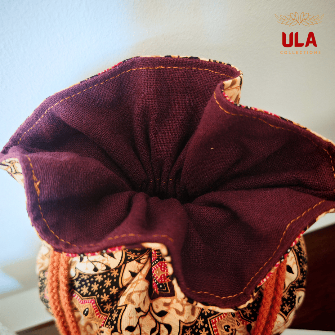 Materials: 100% cotton and batik fabric, cotton lining, cotton rope.