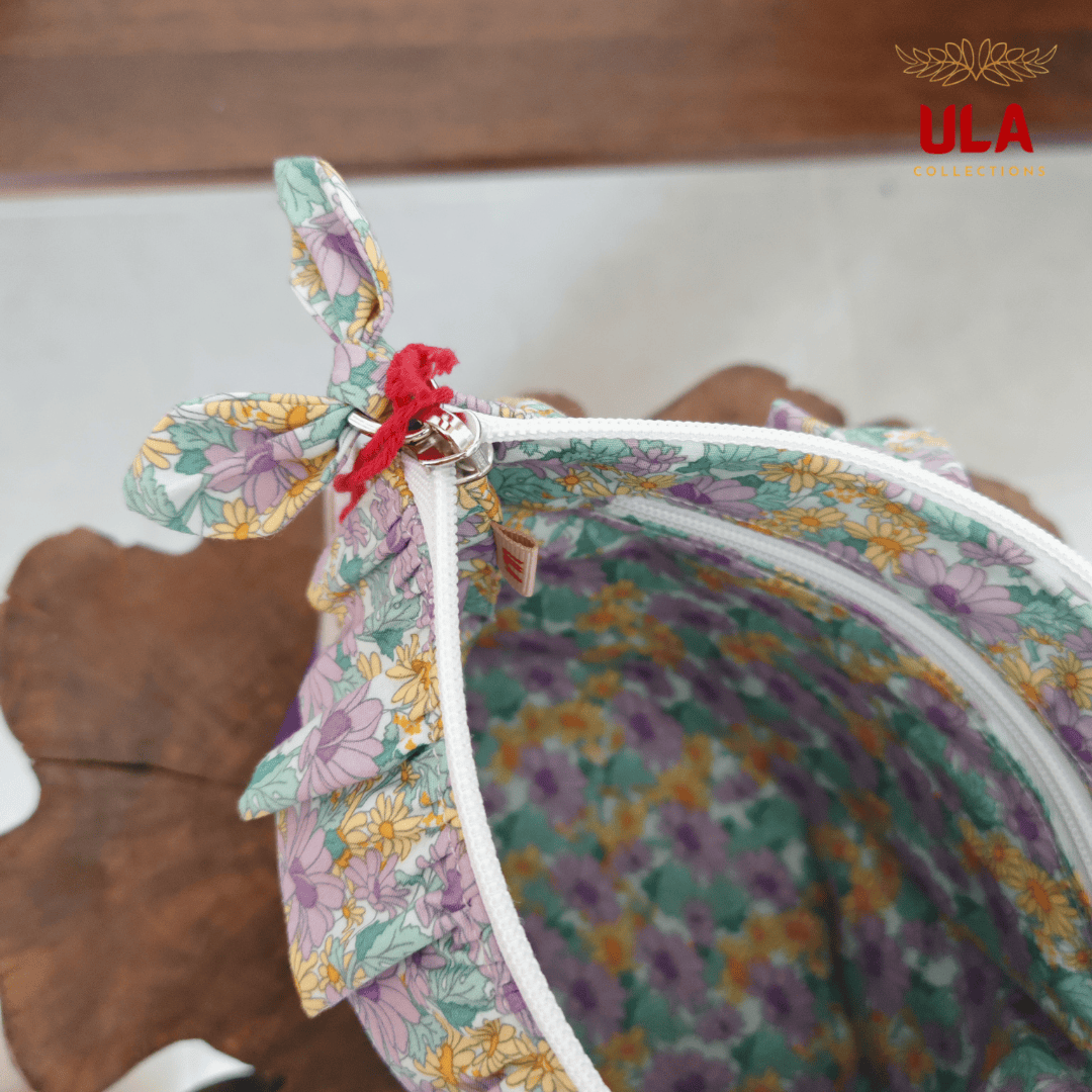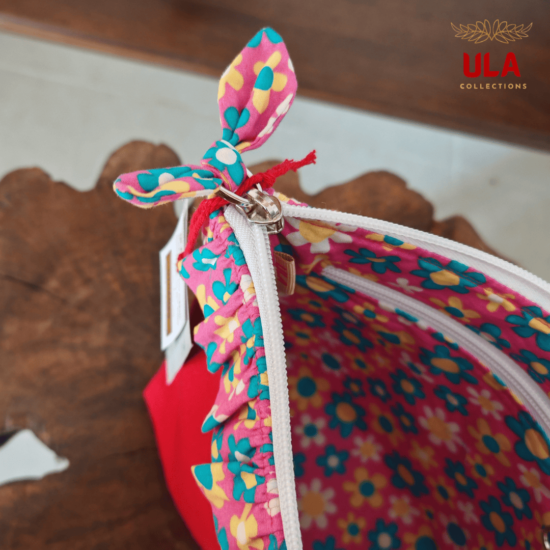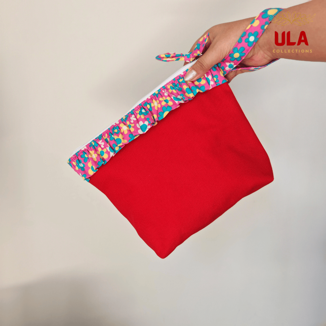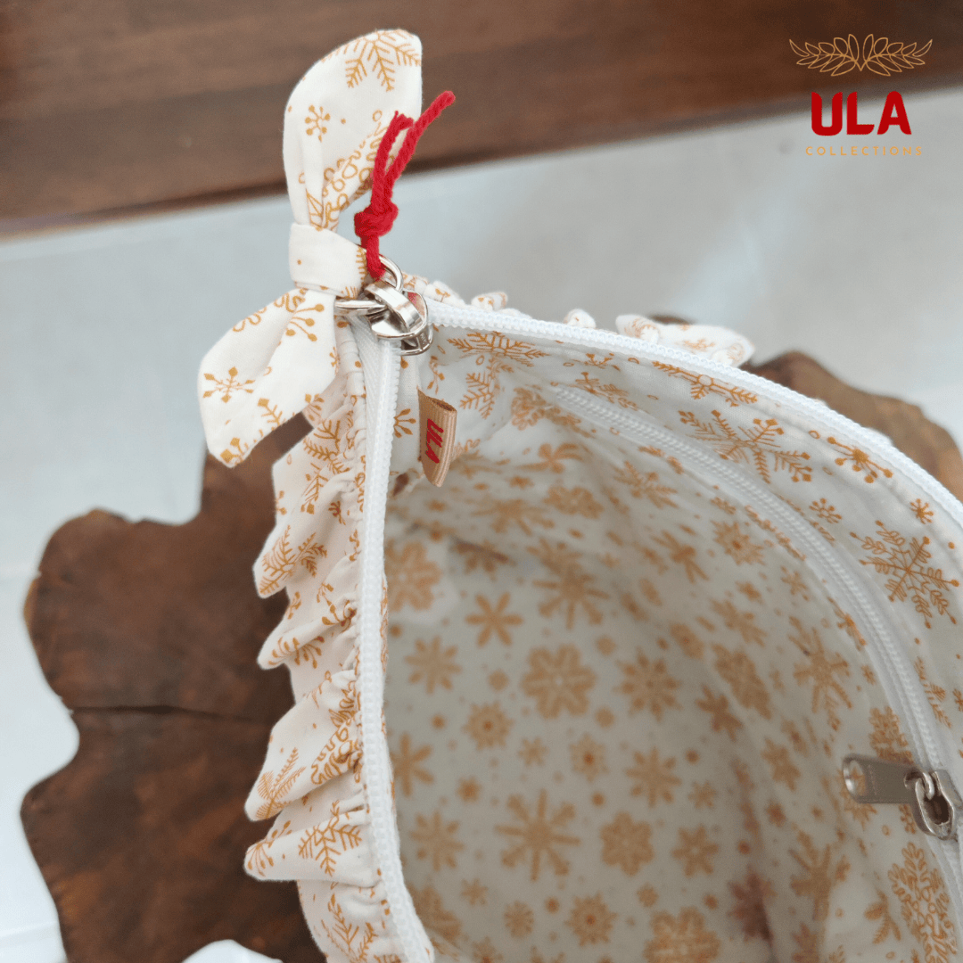 A playful cotton ruffle trim, a matching bow-tie zipper pull, and a coordinated wristlet strap complete the look—making this pouch both charming and easy to carry wherever you go.
