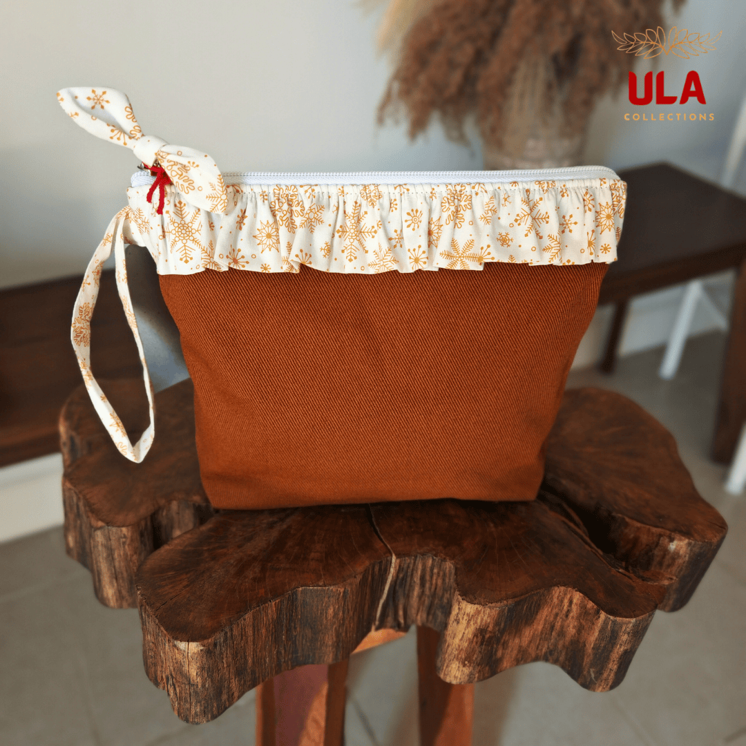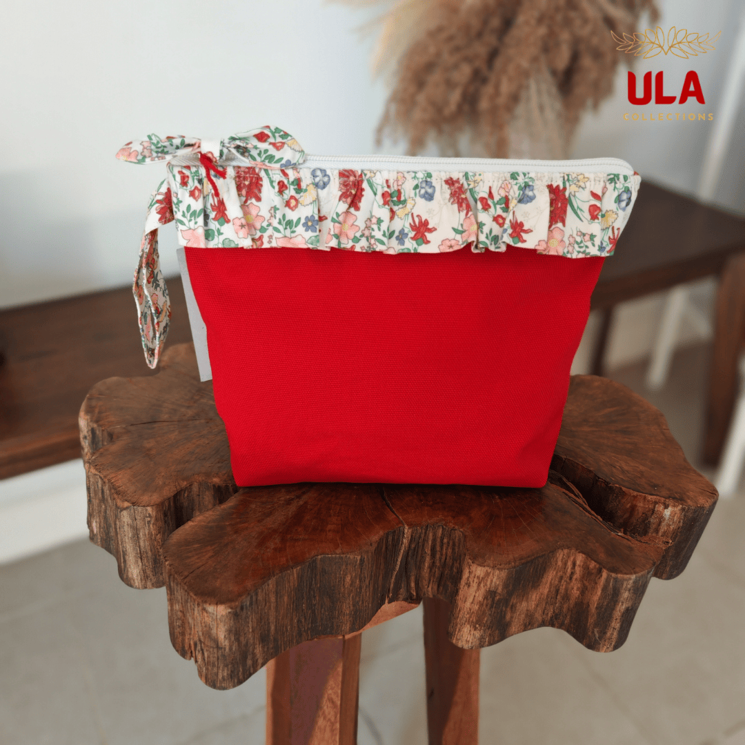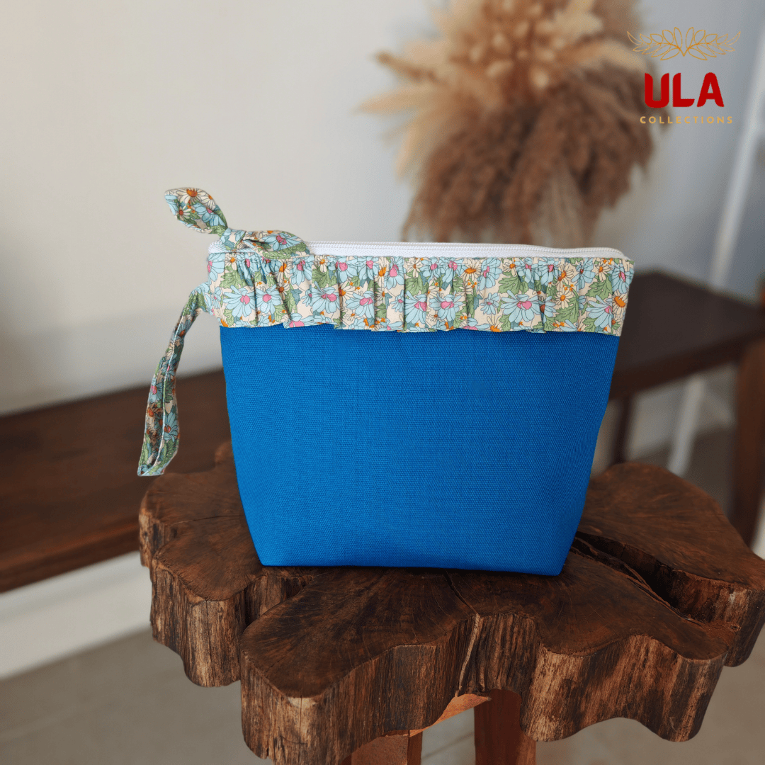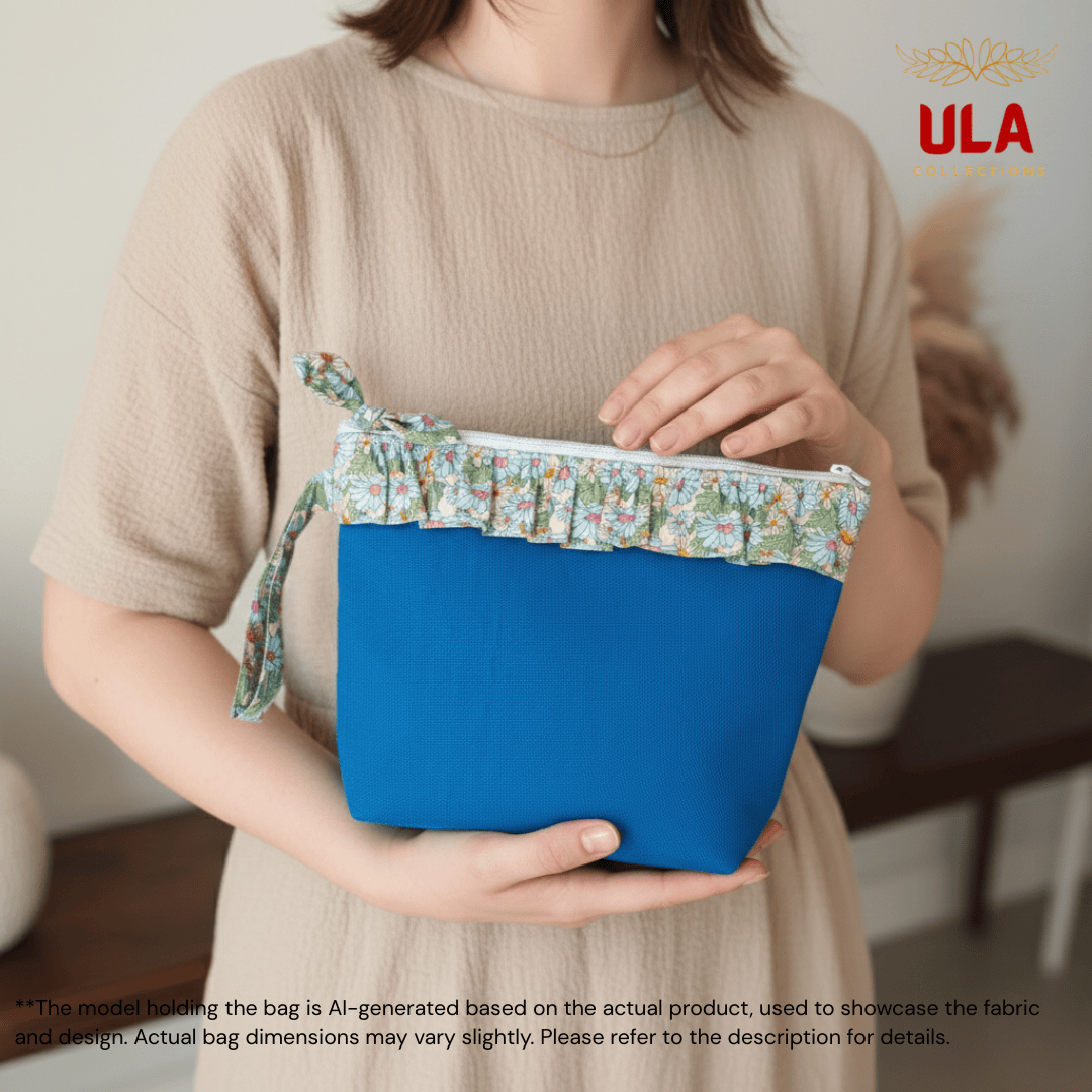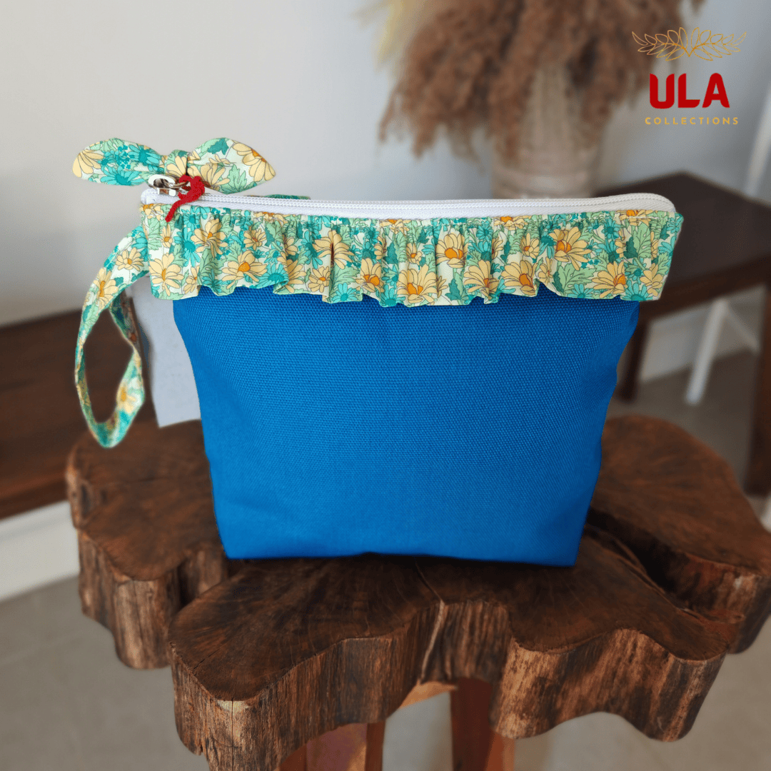 A playful cotton ruffle trim, a matching bow-tie zipper pull, and a coordinated wristlet strap complete the look—making this pouch both charming and easy to carry wherever you go.