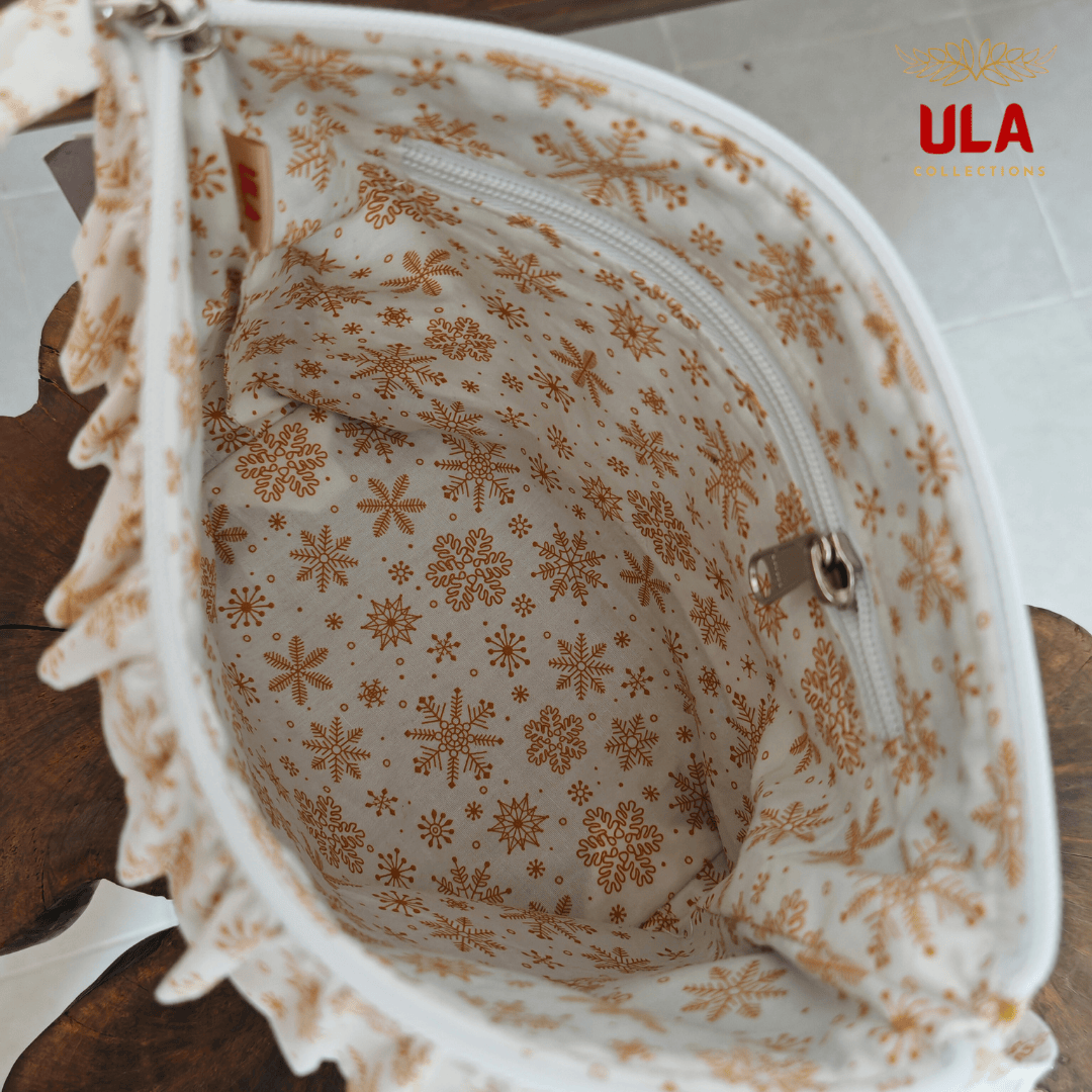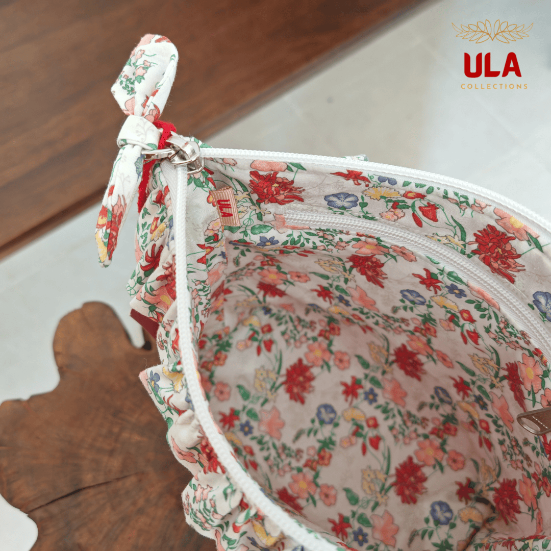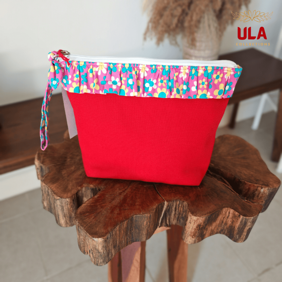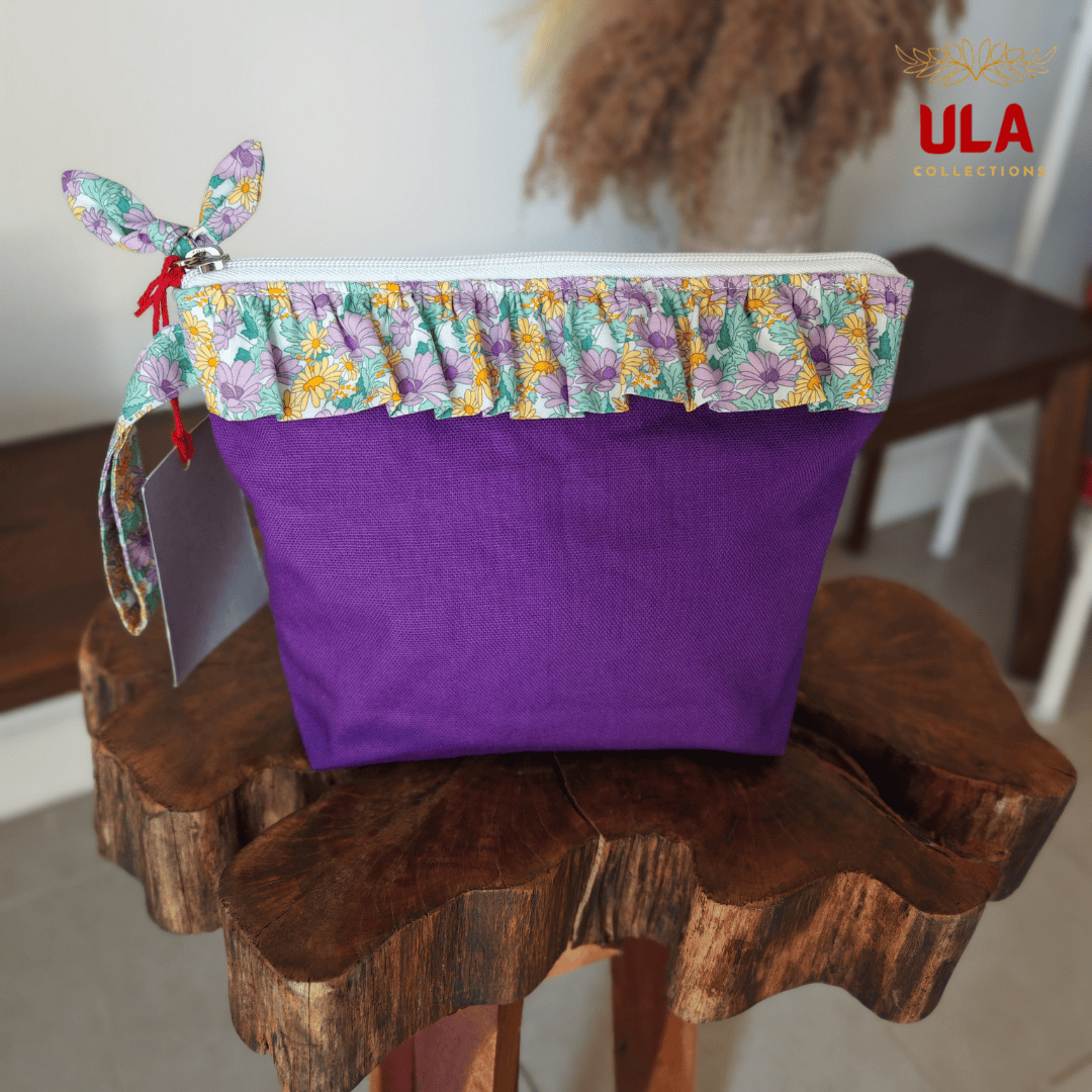 A playful cotton ruffle trim, a matching bow-tie zipper pull, and a coordinated wristlet strap complete the look—making this pouch both charming and easy to carry wherever you go.