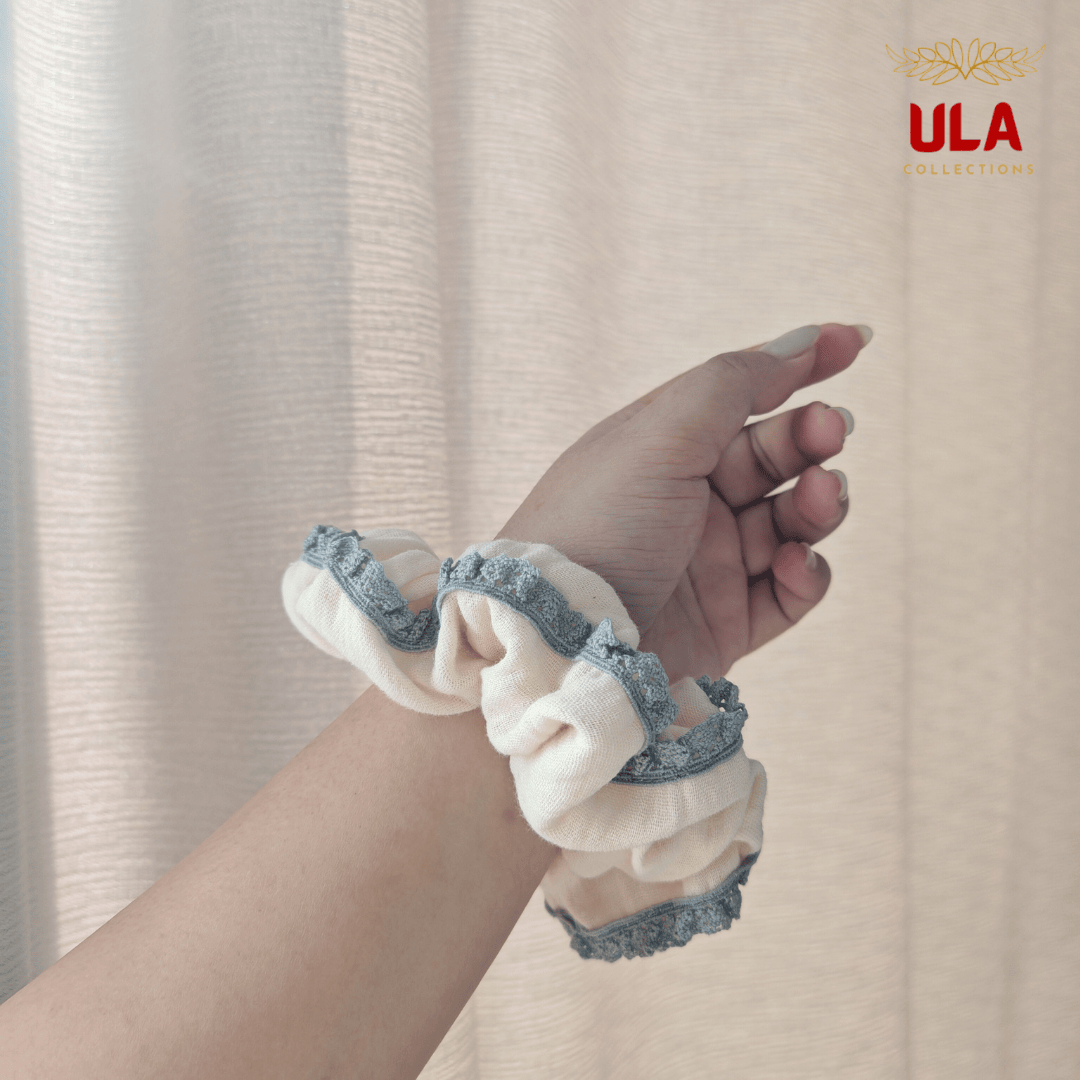 ULA Cotton Cloud Lace Trim Scrunchie – Finished with a delicate grey lace trim, it brings a minimalist yet elegant charm to your hairstyle while remaining exceptionally gentle on your hair.