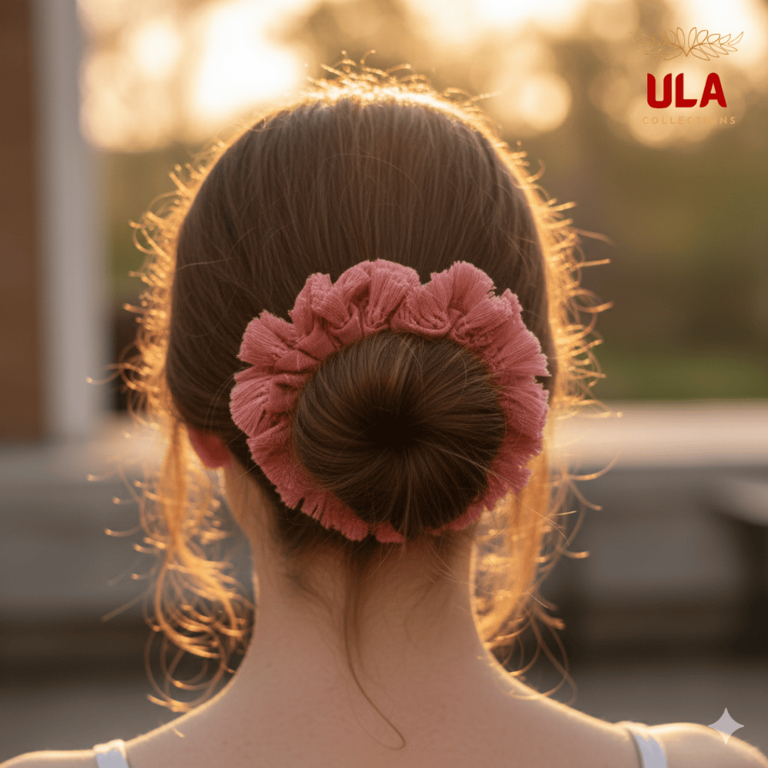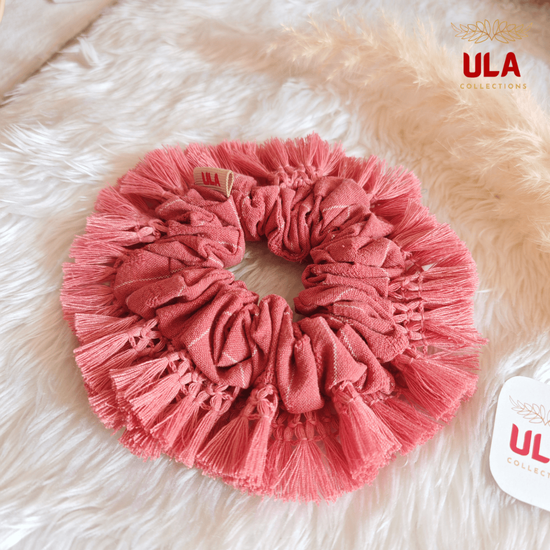 Experience the perfect blend of style and comfort with ULA Collections handmade cotton linen scrunchies. Featuring a trendy dusty pink fringe and a Boho-chic design, this oversized collection is the ultimate accessory for effortless, hair-friendly styling.